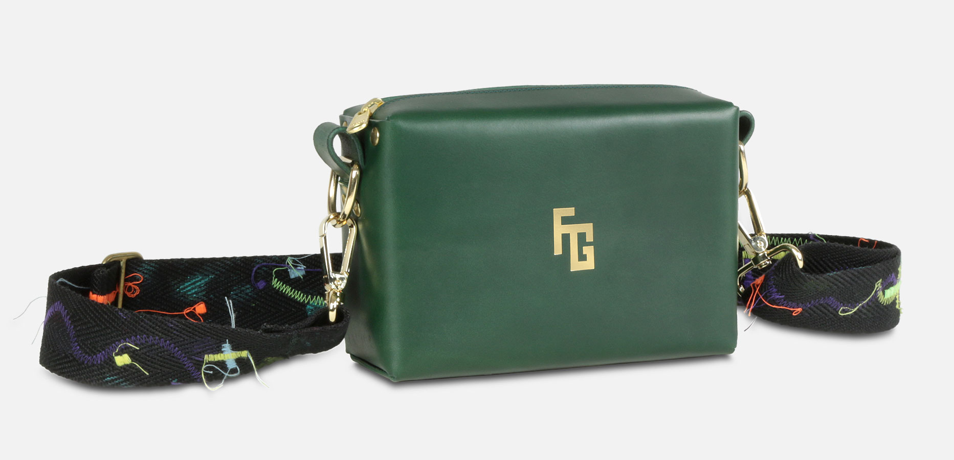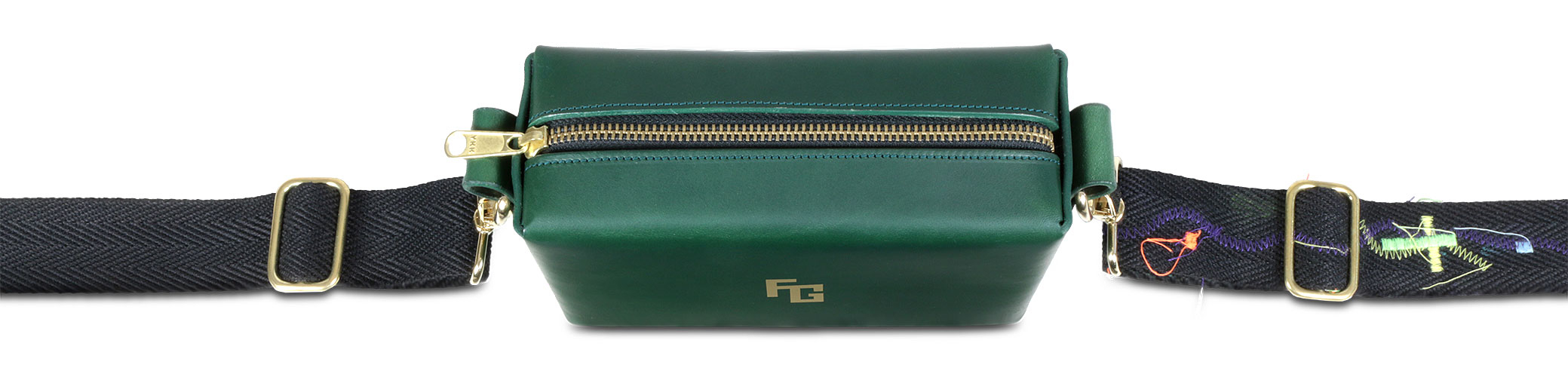El bolso FG HANDBAG by TrogerBags cuenta con un cierre de cremallera y bandolera de color negro mate, además de una correa intercambiable con bordados y puntadas de los colores característicos de la colección. El diseño, inspirado en las piezas de equipaje clásicas de Paris, presenta una superficie exterior de piel de vacuno 100% natural, estampada con nuestro logo en extrusión, además de un interior en terciopelo, con una forma cuadrangular que evoca a los tradicionales fabricantes de baúles, en combinación con el exotismo de la moda actual.
