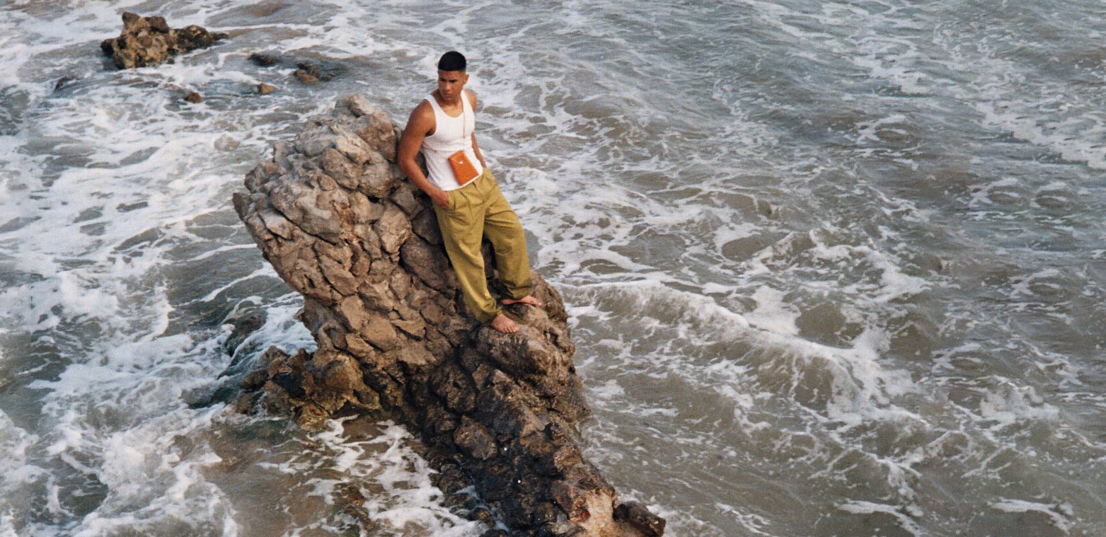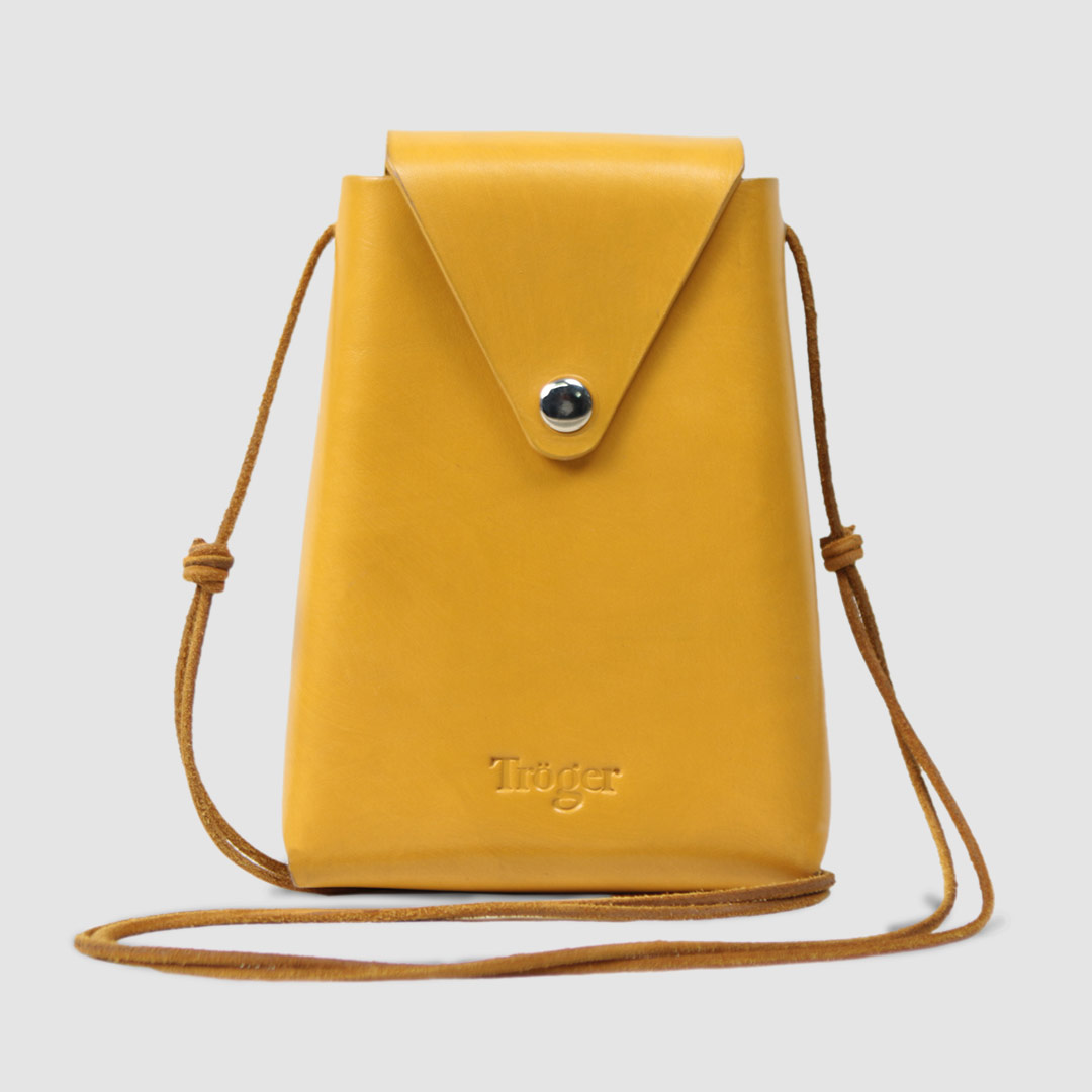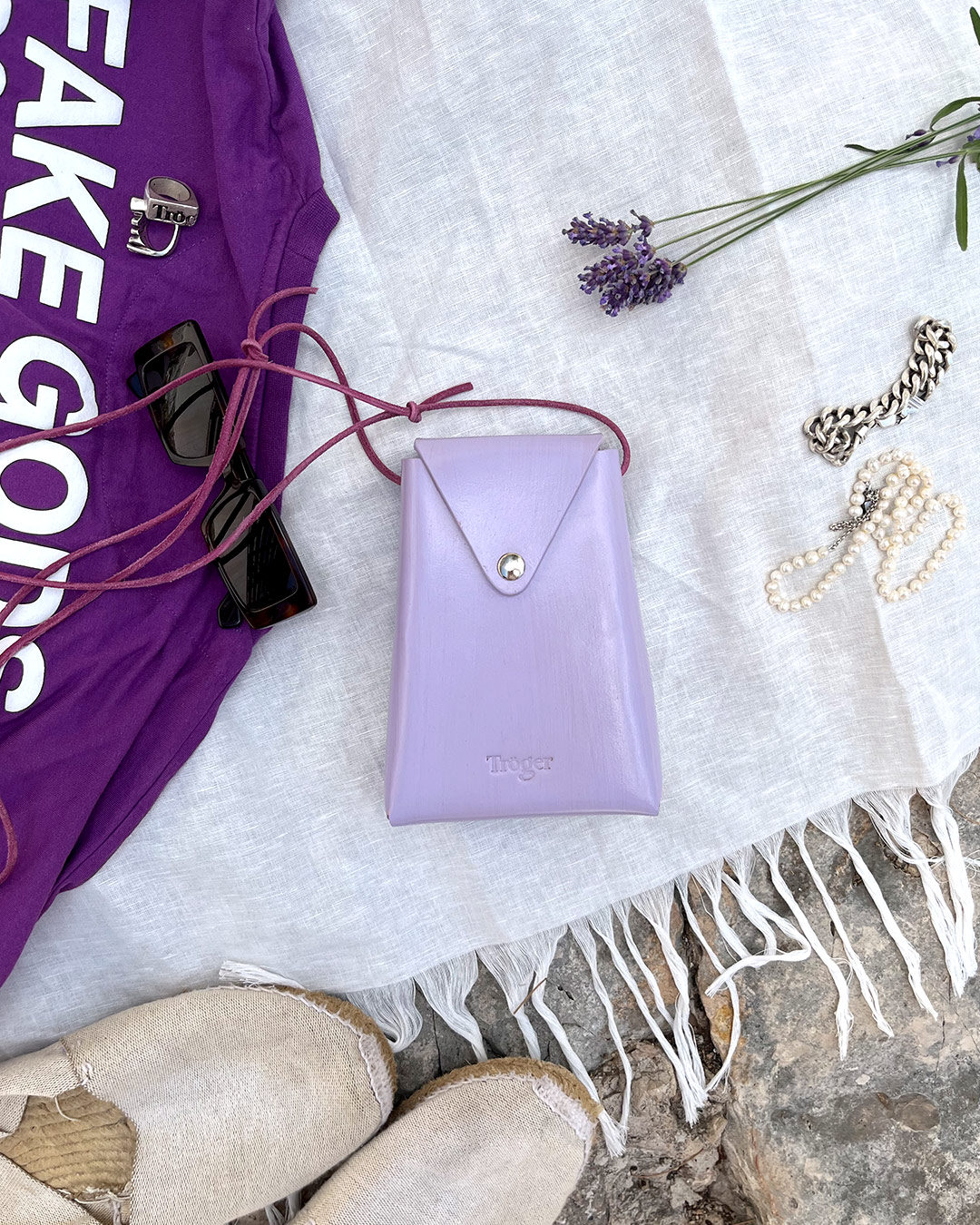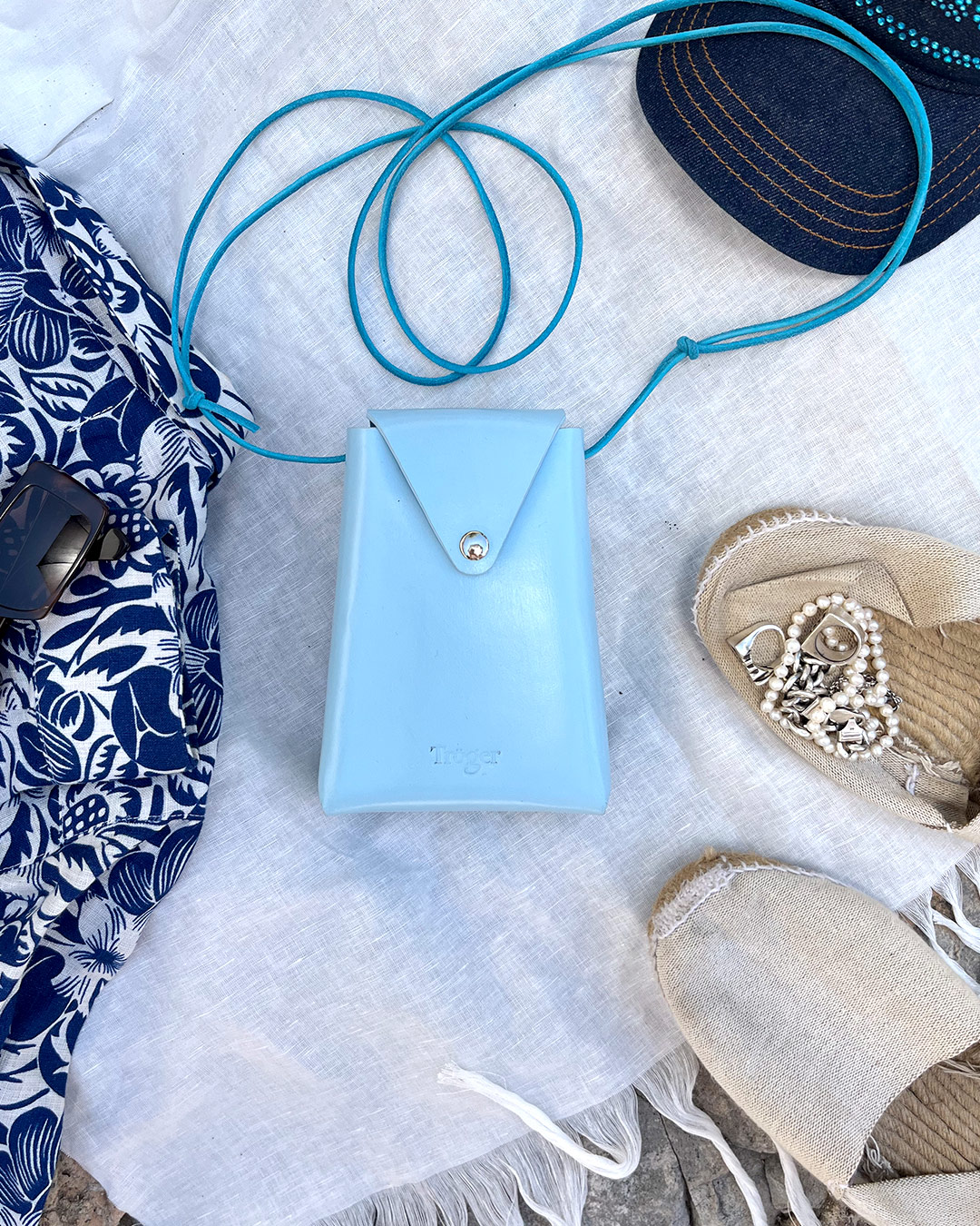 Piel natural, remaches, cuerda de cuero regulable como sujeción y tinte ecológico.