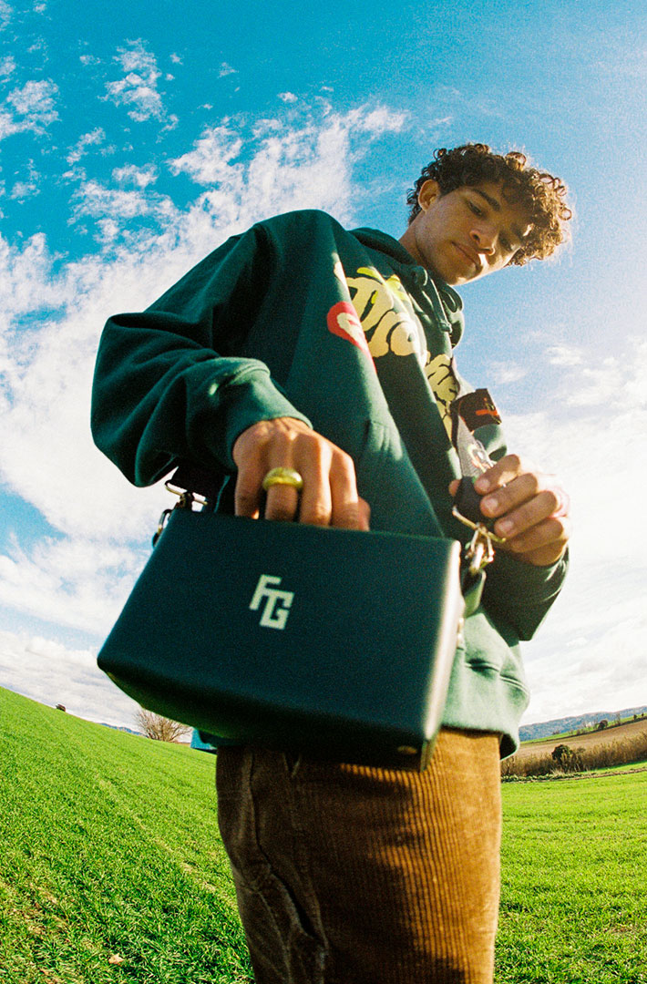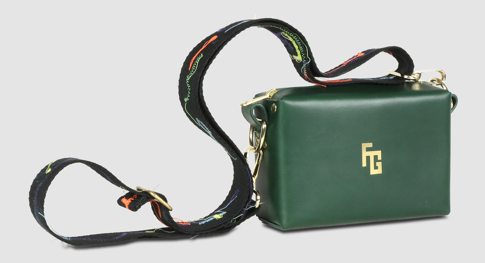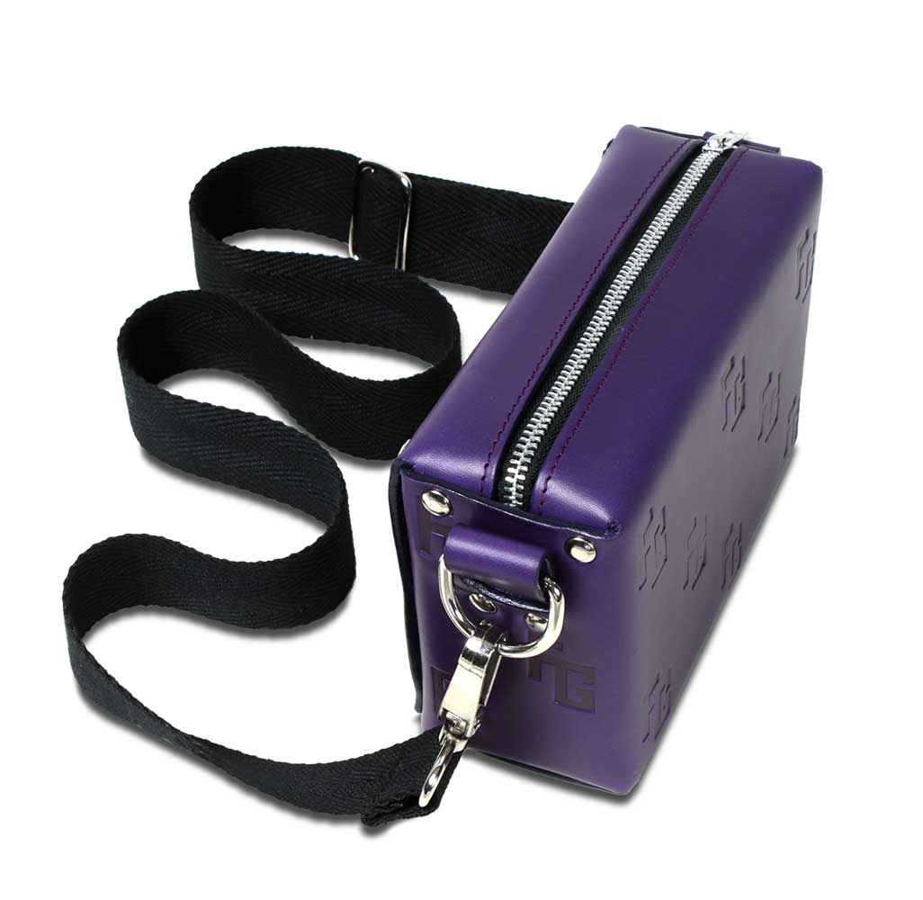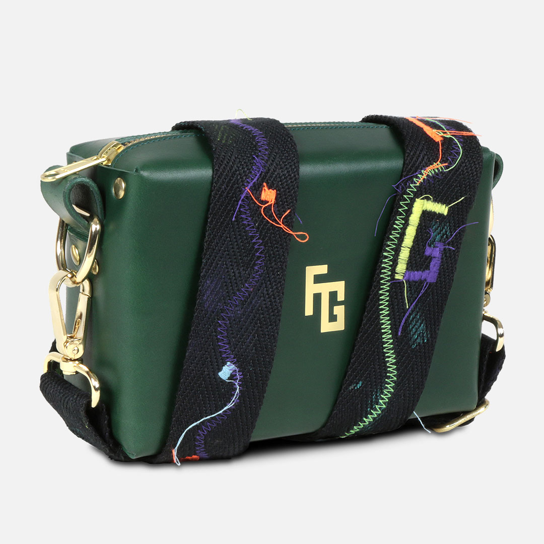 El bolso FG HANDBAG by TrogerBags cuenta con un cierre de cremallera y bandolera de color negro mate, además de una correa intercambiable con bordados y puntadas de los colores característicos de la colección. El diseño, inspirado en las piezas de equipaje clásicas de Paris, presenta una superficie exterior de piel de vacuno 100% natural, estampada con nuestro logo en extrusión, además de un interior en terciopelo, con una forma cuadrangular que evoca a los tradicionales fabricantes de baúles, en combinación con el exotismo de la moda actual.