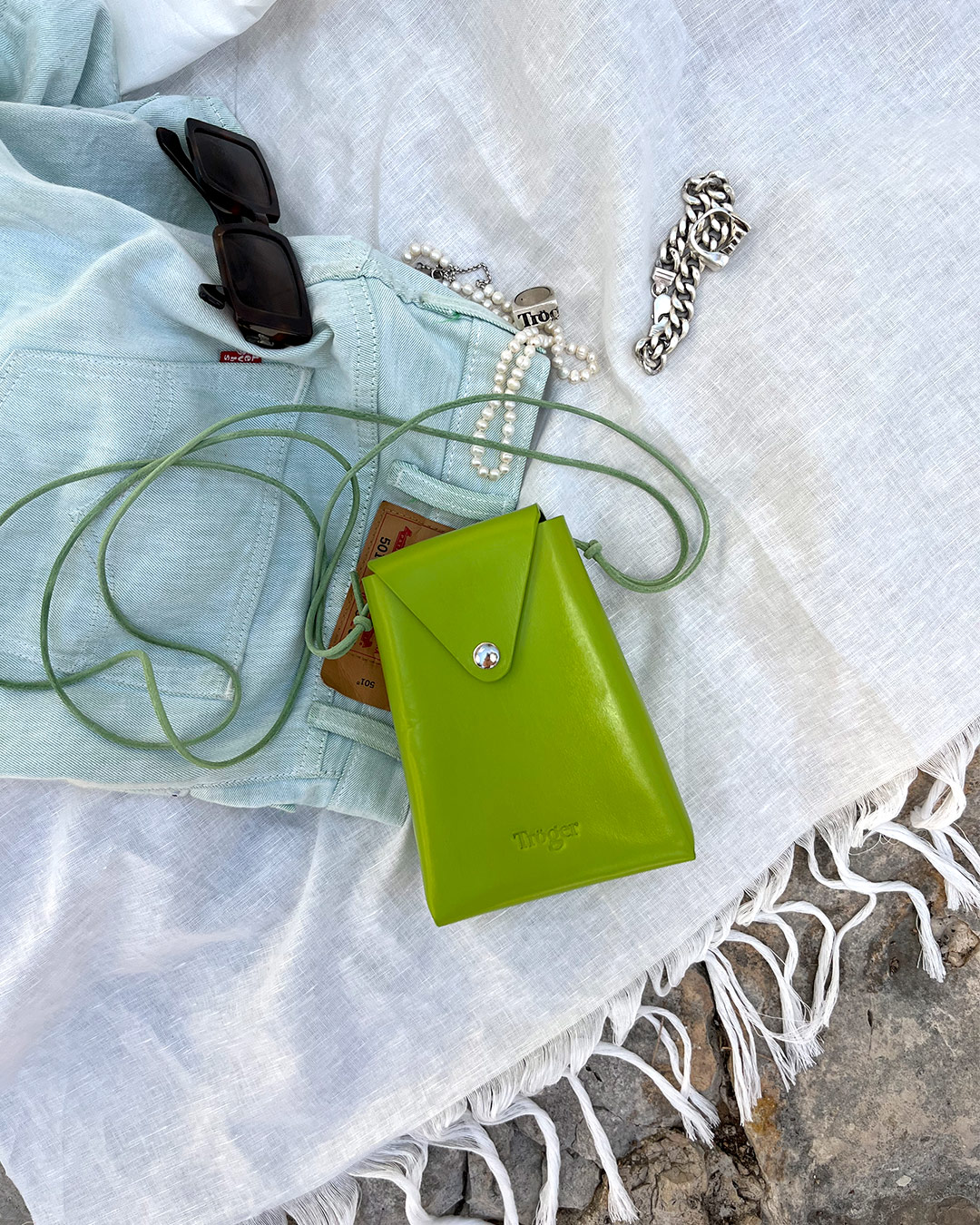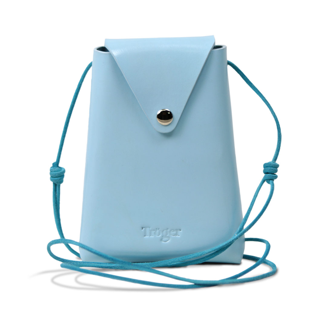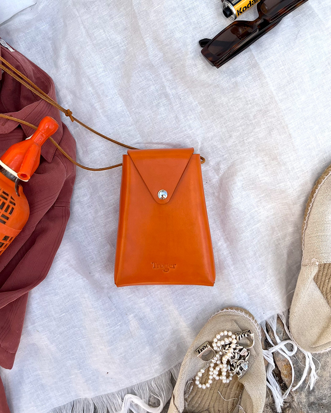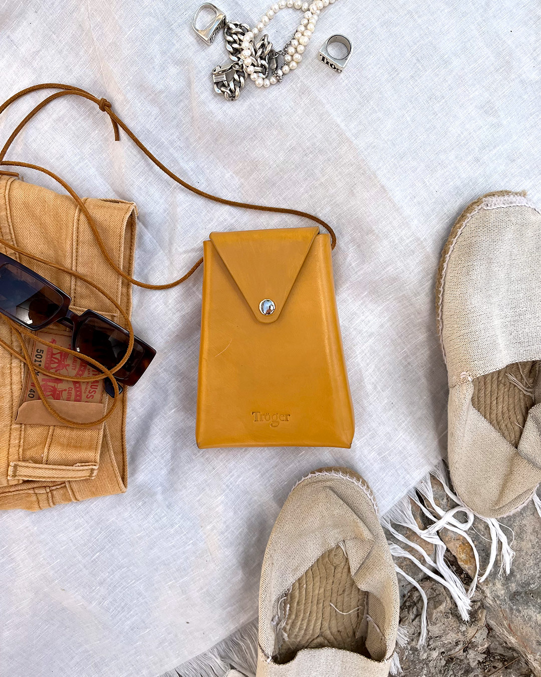 Piel natural, remaches, cuerda de cuero regulable como sujeción y tinte ecológico.