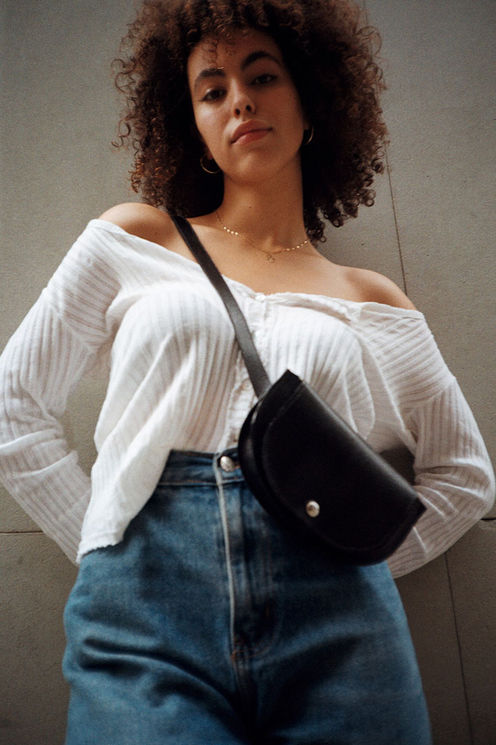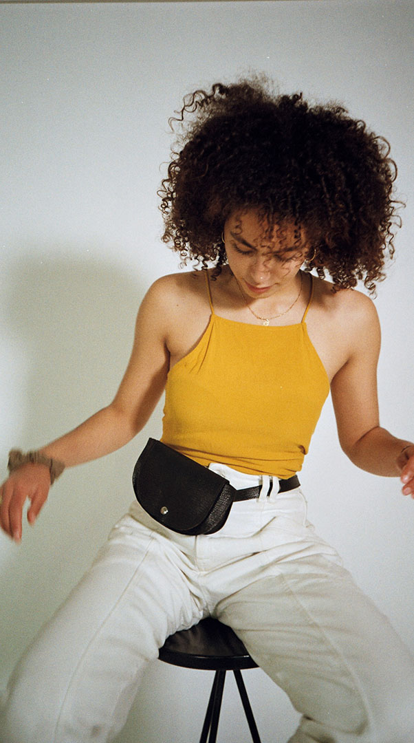 Bolso riñonera de tamaño reducido, ideal para llevar en la cintura o como bandolera.