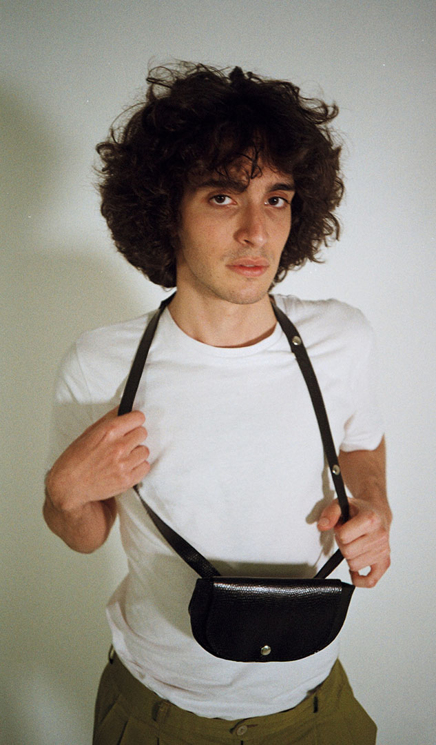 Hecho con piel natural de Pecari, cosido y con cinta regulable de la misma piel.